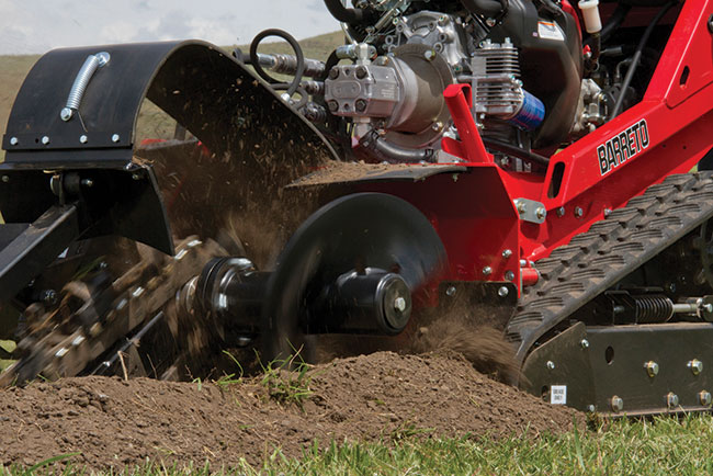 The Barreto model E2348RTKH-6MS is a highly productive track trencher equipped with a Honda GX690 motor. With a total weight of 1,690 pounds and a track width of seven feet, one inch, this unit provides outstanding traction and flotation on wet soil, clay, sand or steep terrains. One-handed controls make this unit easy to operate. Barreto uses rod linkages rather than cables for added reliability. Available in four- or six-inch chain, in lengths of 24, 30, 42 and 48 inches.