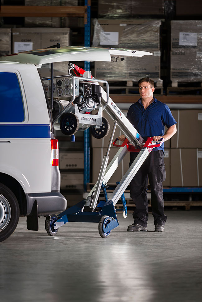 The Makinex powered hand truck PHT-140, previously known as the OneLift, is a universal materials handling solution that enables one person to safely lift and load small equipment or bulky goods weighing up to 309 pounds. It provides a quick and easy alternative to using a forklift or tailgate loader for small loads. The Makinex powered hand truck has many applications and can be used in workshops, warehouses, factories, depots, distribution companies and rental yards. The PHT-140 features powered lift via a 12-volt 25-amp linear actuator. It is easy to operate. The lifting arm reach is controlled by the user lifting or lowering the handles and arm height is controlled via a simple thumb switch. The unique design enables one person to lift and load directly into vehicles or to place equipment and small loads on bench tops. It eliminates awkward and dangerous one- or two-person lifts and reduces the incidence of back and other injuries caused by heavy lifting. The hand truck is lightweight and easy to manoeuver. After use it can be folded down flat for easy transport and storage. It comes standard with a hook attachment for lifting, moving and loading small equipment and machinery fitted with a lifting eye, for example, water pumps, generators, air compressors, and plate compactors. A fork attachment for lifting, moving and loading small pallets and skids is optional and sold separately.