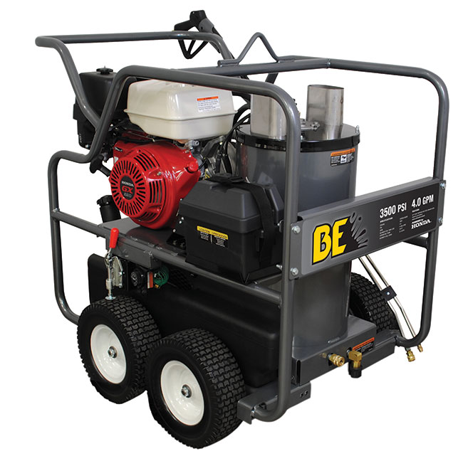 The HW3513HAD hot water pressure washer from BE Pressure Supply features a low-pressure chemical injector, low oil shutdown, a 6.1-liter fuel tank, a burner tank, a top-fired powder-coated heat exchanger and an electromagnetic firing system. It produces 3,500 PSI at four gallons per minute using a Honda GX390 engine and an AR Triplex pump. The unit comes with a 50-foot hose; a gun and wand; 13-inch pneumatic tires; and a five-year pump warranty.