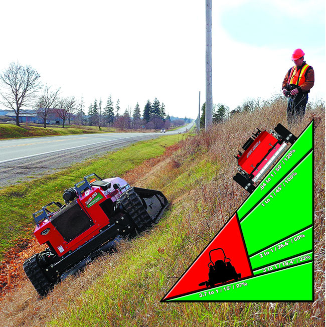 The Slope-Pro mower is designed to mow difficult and hazardous locations, including up to 50-degree side slopes. The design emphasizes operator safety and productivity on both sloped and flat terrain, operating where ride–on mowers cannot. There are many locations that are too hazardous to mow and maintain by either conventional or manual methods, and this number continues to grow. Worker health and safety protocols as well as vegetation-control regulations (herbicide restrictions) continue to be tightened and more strictly enforced. As a rental product targeted towards a required albeit specialized application, the Slope-Pro can sustain a high charge-out rate – increasing ROI and cash flow – and can help drive increased traffic to the store. It is truly a heavy-duty industrial mower and has been designed to keep utilization up and ownership costs low. It is easy to operate, reducing the chance of abuse and making renting stress-free. The Slope-Pro fits on most landscape trailers so it is easily picked up or delivered. The mower requires little routine maintenance and the time required for pre-rental prep is minimal. Most importantly, it is the right tool for hazardous jobs saving the abuse of other fleet mowers such as ZTRs. The Slope-Pro is designed, manufactured and distributed worldwide by Progressive Turf Equipment based in Seaforth, Ont.