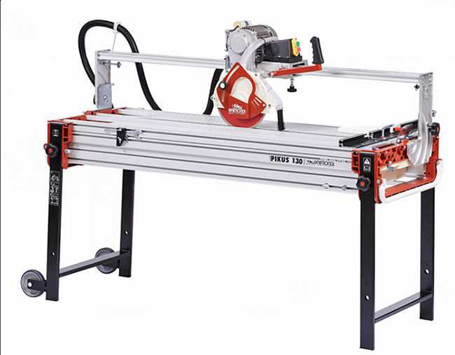 The Raimondi Pikus 130 is an Italian-made and -assembled professional wet saw for large-format porcelain tiles and stone. This saw offers a diverse range of abilities with a powerful belt-drive, 1.5-horsepower motor and a 10-inch blade that has great torque for its size. With a long 130-centimeter cut capacity, it allows for most large-format tiles to be cut with ease. It also sports a massive plunge-cut ability for cutting bricks, pavers, or stone up to six inches thick in two passes. The smart, cast and extruded aluminum frame design allows for easy transportation to and from a jobsite, and even through doorways for cutting indoors. The tilting motor assembly grants the operator the easy ability to perform up to 45-degree mitre or beveled cuts typically only obtainable by large CNC machines. The Pikus 130 comes assembled and ready to use.