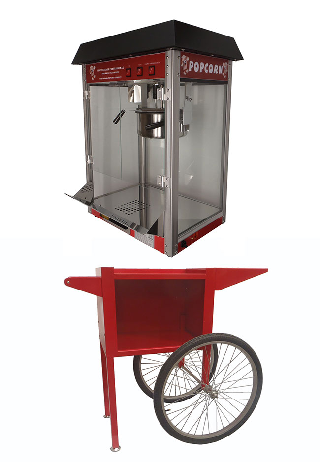 The Center Stage model is a true commercial-grade, CSA-approved, popcorn machine able to stand up to the rigours of the rental industry. This professional popcorn machine produces a powerful 1,664 watts. It has a 300-watt deck heater and a 50-watt warming/presentation bulb, which guarantees hot theatre popcorn. The Center Stage has a stainless-steel cabinet and deck, ensuring years of durability with a hard-coat anodized, high thermal-mass kettle for easy cleaning and dual thermostats for superior performance. The kettle is equipped with a magnetized lid for ease of loading and cleaning. This eight-ounce model works on a standard 120-volt 15-amp circuit. The old-maid drawer will collect any unpopped kernels. The pot stirrer is direct-drive, eliminating jambs and plastic gears. The top canopy is vented to prevent overheating. The thicker-gauge frame makes it rental rugged. The Center Stage will produce approximately the equivalent of 160 small popcorn bags per hour. The machine measures 22 inches long by 16.5 inches wide by 30 inches high and weights 65 pounds. Thick, sturdy, and robust, the Center Stage cart is entirely constructed from metal with antique-style wheels and bearings for smooth operation. It includes convenient storage for all popcorn supplies. It measures 38 inches wide by 23 inches deep by 33 inches high and weighs 55 pounds. The Centre Stage machine comes with a full three-year warranty that covers the pot.