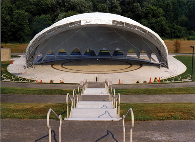 The high arched ends of Warner Shelter Systems’ Arabesque theatre tent allows generous height over a stage at one end and bleacher seating at the other. Alone or joined together, the tents create a large attractive, clearspan interior. Arabesque Theatres have been used extensively for major fairs, festivals, and exhibitions across North America. By removing one end of the Arabesque it becomes a stage cover. All assembly is at ground level and parts are interchangeable. The Arabesque creates a distinctive look with elegant curved lines on both the frame and cover. The patented framing adjusts to fit a range of ground conditions and stage widths and the curved tension cover delivers efficient sound projection. Safe and dependable, the cover bears low, uniformly distributed tension. The aerodynamic design reduces wind loading. The arch frame is external to the tent providing an obstruction-free interior.